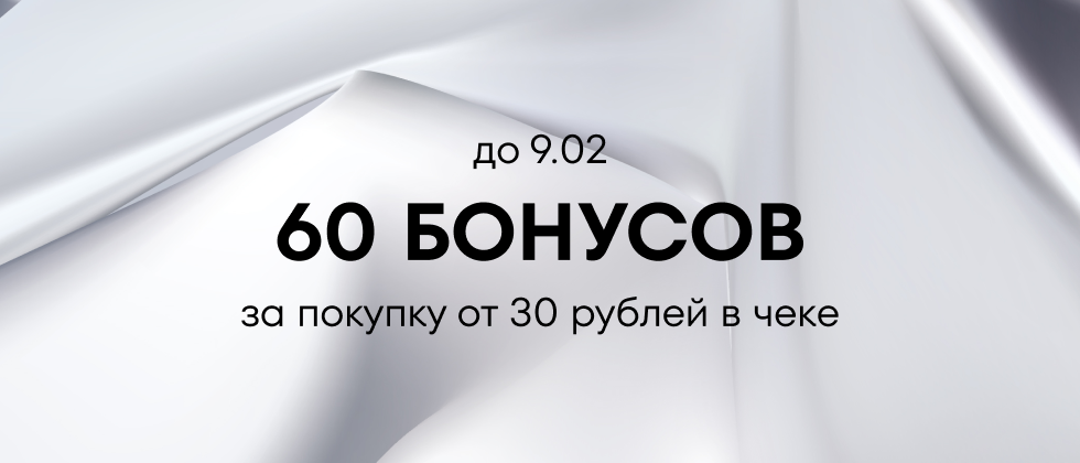 С 2 декабря 2025 года по 9 февраля 2026 включительно начисляем 60 бонусов за каждые 30 руб. в чеке на покупки себе и близким. Копи бонусы и покупай стильные новинки с выгодой, добавь в образ лёгкости, свежести и красок!